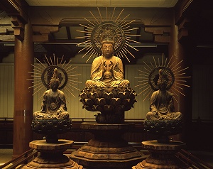 こちらが本尊の阿弥陀三尊坐像です。本堂の裏、階段を上がったところにあるお堂に安置されています。