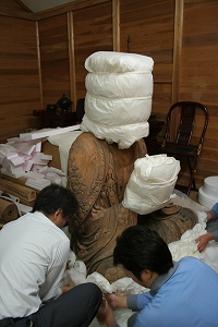 頭と手の保護をしっかりしてからお像の周りに薄くてやわらかい紙を丸めたものを当てます。