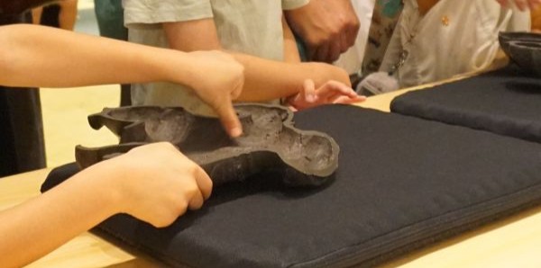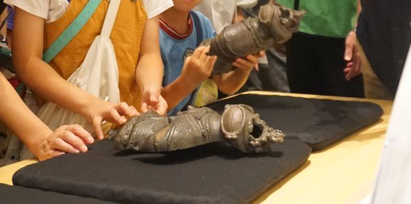 お話を聞いて、遮光器土偶のレプリカををさわってみましょう。