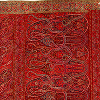 インド北西部・カシミール地方に生育するカシミヤ山羊からは、上質な毛糸が生産されました。それをさまざまな色に染め、綴織や刺繡で細密な模様を表わしたカシミヤ・ショールを中心に展示します。インド・ムガル朝の王侯貴族のみならず、ヨーロッパにも輸出され愛好されたカシミヤ・ショールや、その人気に影響をうけてイラン・ケルマン地方で製作されたカシミヤ・ショール、インド・ムガル王朝やイラン・サファヴィー朝時代の衣装や絨毯も併せ、同時代における貴族たちの華やかな生活をイメージした展示です。