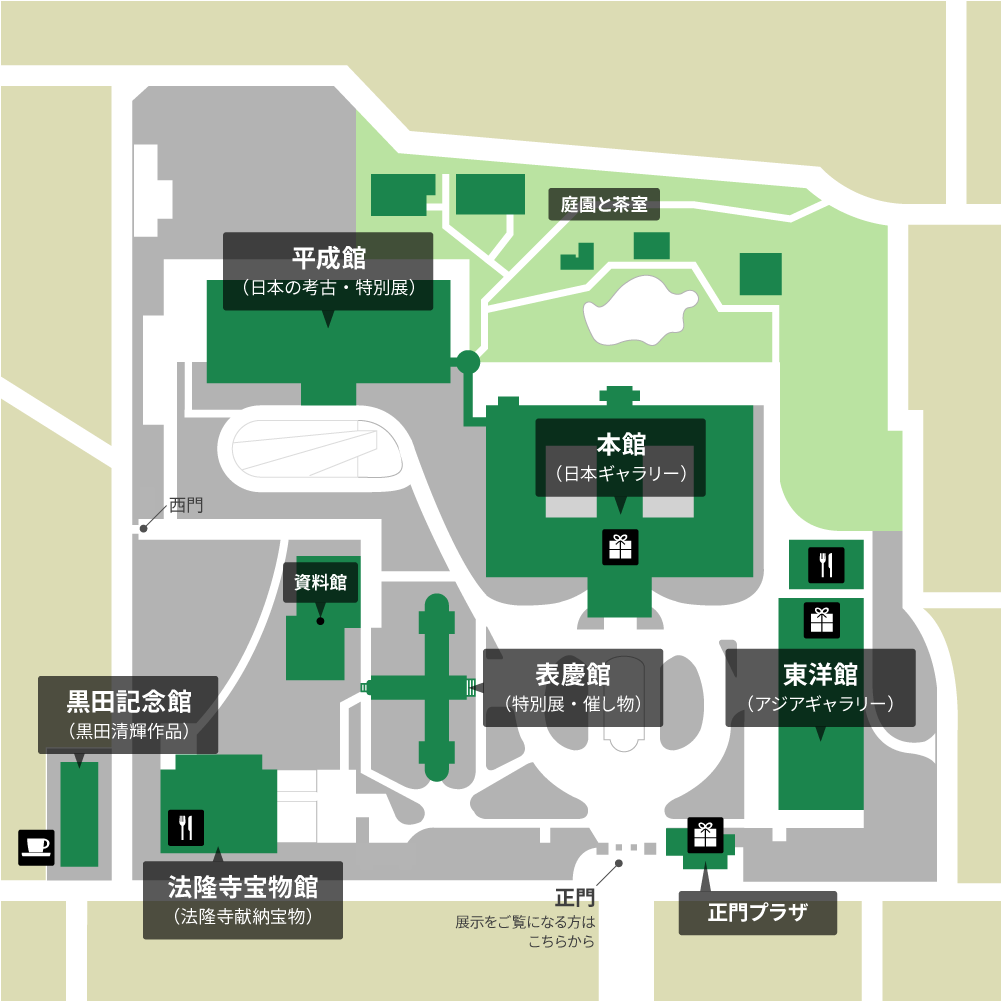 東京国立博物館の構内には、黒門や校倉など由緒ある建造物や屋外彫刻などがあり、常時ご覧いただくことができます。