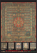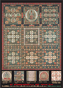 金剛とはダイヤモンドのことで、大日如来の知恵が、こわれることのない強いものであることを表しています。9つのグループに分けられていて、右上の「理趣会(りしゅえ)」以外すべて中心が大日如来。まわりをとりかこむ仏たちとの間では、大日如来の知恵が、内から外、外から内へと、コンピュータの回路のように、たえまなく動き続けているのです。四角と丸の組み合わせが特徴的ですね。 | 大日如来を中心に、12のグループで構成されています。すべての仏は大日如来から生まれるのであり、それとおなじように、人々の心の中にある(胎蔵する)「さとり」を開く種を、大日如来が守り育てていくようすを表しています。金剛界曼荼羅では、大日如来の知恵が規則ただしく、縦横ななめに動いているのに対し、こちらでは太陽の光のように、やさしく力強く、中心から世界を照らしているのです。 |