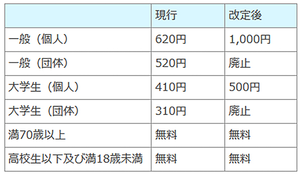 一方、同プランは、こうした改革プランを強力に推進しつつ、貴重なコレクションを次代の国民と世界の人々に確実に継承できる財務基盤を整備するため、「基本料金の引き上げなど、入館料の見直しを検討」することも、合わせて表明しました。 その後1年近くをかけ、外部有識者の方々から意見を聴取しながら、慎重に検討を進めた結果、平成18年以来約14年ぶりとなる観覧料金の全面的な見直しを行い、本年4月1日に以下の通り改定を行うこととさせていただきましたので、お知らせいたします。