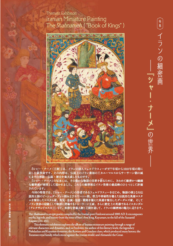 今回の特集では、『シャー・ナーメ』の作者であるフェルドウスィーをはじめ、物語の核となる伝説的王朝のピーシュダーディー朝およびカヤーニー朝、怪力や神秘性を備えた伝説的な英雄ロスタムを輩出したロスタム家、勇気・忠誠・知恵・戦略を備えた英雄を輩出したグーダルズ家、そしてイラン世界の宿敵として物語に登場するトゥーラーン王家、さらに歴史上の英雄であるイスカンダル(アレクサンドロス大王)など、多彩な登場人物と王朝を通して、イランの細密画の魅力に迫ります。