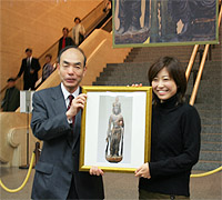 「仏像」展ご来館30万人目は、横浜市の梶田祥子さん(27)。お寺が好きで、京都をよく訪れるそうです。この日はご友人から「仏像」展の評判を聞いて 来館されたとか。今日のお目当て、という滋賀・向源寺蔵の十一面観音菩薩立像(国宝)の写真額を、野崎館長からプレゼントしました。梶田さん、ご来館あり がとうございました。