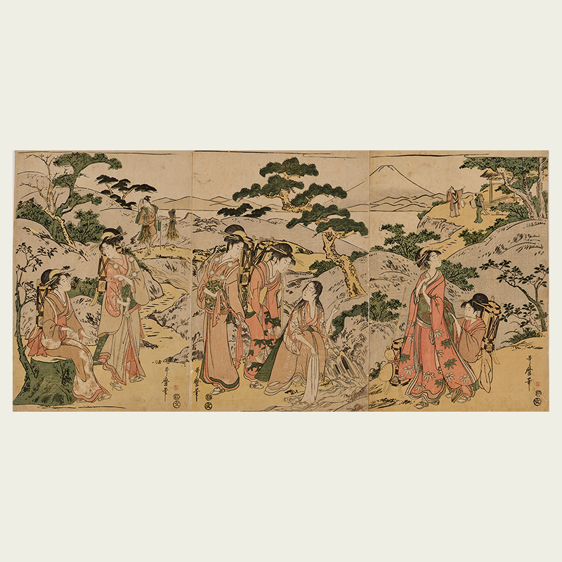酒呑童子絵の広がりを表す作品酒呑童子退治へ向かう頼光と四天王を、江戸の女性に置き換えた美人画見立大江山(みたておおえやま)