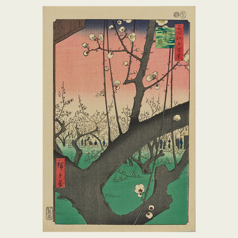 内山晋氏寄贈「名所江戸百景」は、江戸の町を季節感豊かに描写した歌川広重(うたがわひろしげ)最晩年の連作です。本図には亀戸天神付近にあった梅園(ばいえん)が描かれています。目が覚めるような鮮やかな空の色や、手前に梅樹を大きく描いた大胆な構図がみどころです。