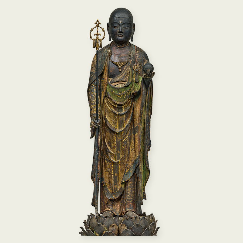 地蔵菩薩は錫杖(しゃくじょう)を持ち、あらゆる場所を渡り歩いて人々を救う仏。本像ははっきりとしたまなざしやバランスの良い体つきなど、鎌倉時代彫刻の特色が良く表れています。細く切った金箔で描き出した衣の文様が制作当時のものである点が貴重です。