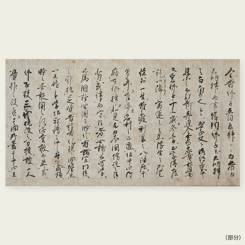 関白藤原忠通(ふじわらのただみち)の子で、天台座主(てんだいざす)を務めた慈円(じえん 1155~1225)が、氏神の春日明神に祈願した際の文書です。神仏の前で願いを述べる表白(ひょうびゃく)という形式で、本文には訓点が付されます。「春日大明神に白(もう)して言(もう)さく」とはじまり、13歳で出家して以来、仏道と政道のために歩んできた人生を顧みて、将来の政を担う一族への加護を祈っています。筆致は力強く勢いに満ち、鋭く張りのある線と、自然に移ろう美しい墨色がみられます。慈円70歳、亡くなる前年に立てた願いは、父譲りの雄渾(ゆうこん)な書風で表され、後世に伝えられました。