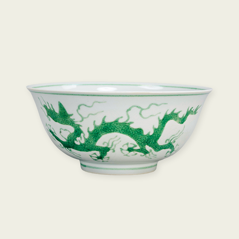 強大な勢力を誇った明王朝と歩みをあわせるように、生産力を伸ばした15~16世紀の景徳鎮官窯では、多彩な器種が登場し、さらにさまざまに技巧を凝らした製品がつくられるようになりました。本作品は五爪(ごそう)の龍を線刻で表し、その部分だけ透明釉をかけずに焼成して上から緑釉で彩ったものです。これは正徳年間の官窯でさかんに行われた装飾法のひとつで、気品漂う美しい白色の素地と明るく爽やかな上絵具の発色が大きな魅力となっています。