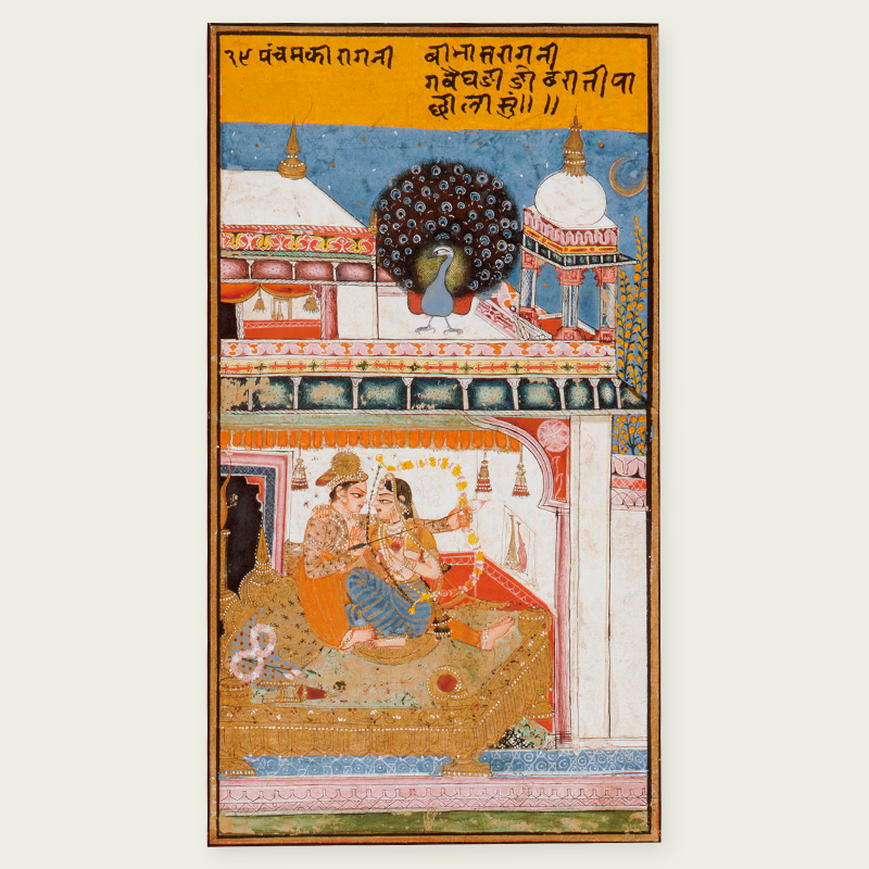 インドの細密画には、「ラーガマーラー(楽曲絵)」とよばれる音楽と絵画が融合した独特な表現があります。ラーガマーラーは、インド古典音楽のさまざまな旋律であるラーガを絵画化しています。