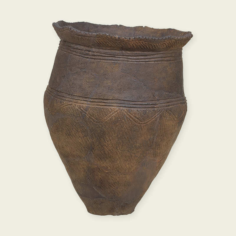 寒冷な気候のために水田稲作が定着しなかった縄文時代の北海道では、縄文時代の伝統を引き継ぎつつ、漁撈(ぎょろう)・狩猟・採集を生業にした独自の文化が営まれました。これらの文化を続縄文文化(前4世紀~7世紀)、オホーツク文化(5〜12世紀、北海道では9世紀まで)、擦文文化(7世紀~12世紀)とよんでいます。本例は続縄文時代の土器で、主に煮炊きに使われました。ぜひ展示室でご覧ください。