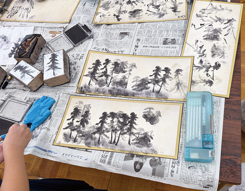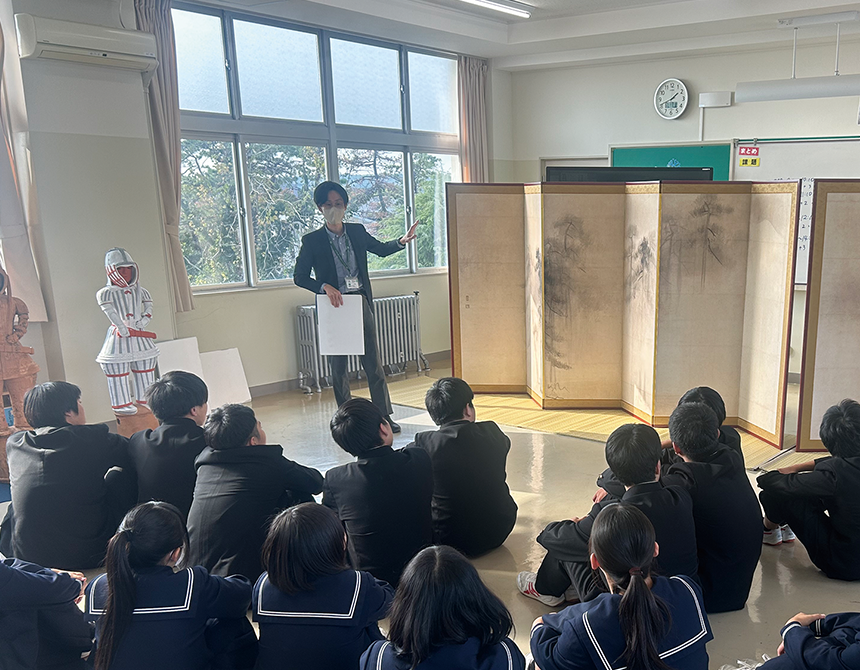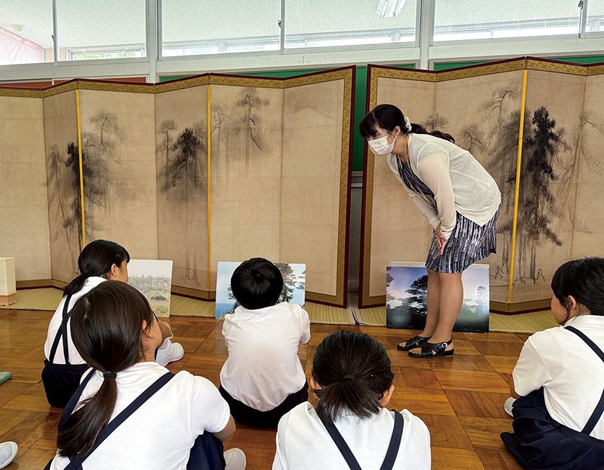 普及事業では、能登(石川県)ゆかりの国宝「松林図屛風」の高精細複製品等を使用した訪問授業を、輪島市、七尾市、志賀町に所在する小中学校等教育機関・計16校で実施しました。復興途上の厳しい環境のなかで、授業の実施を希望してくださった学校の皆様に感謝を申し上げます。